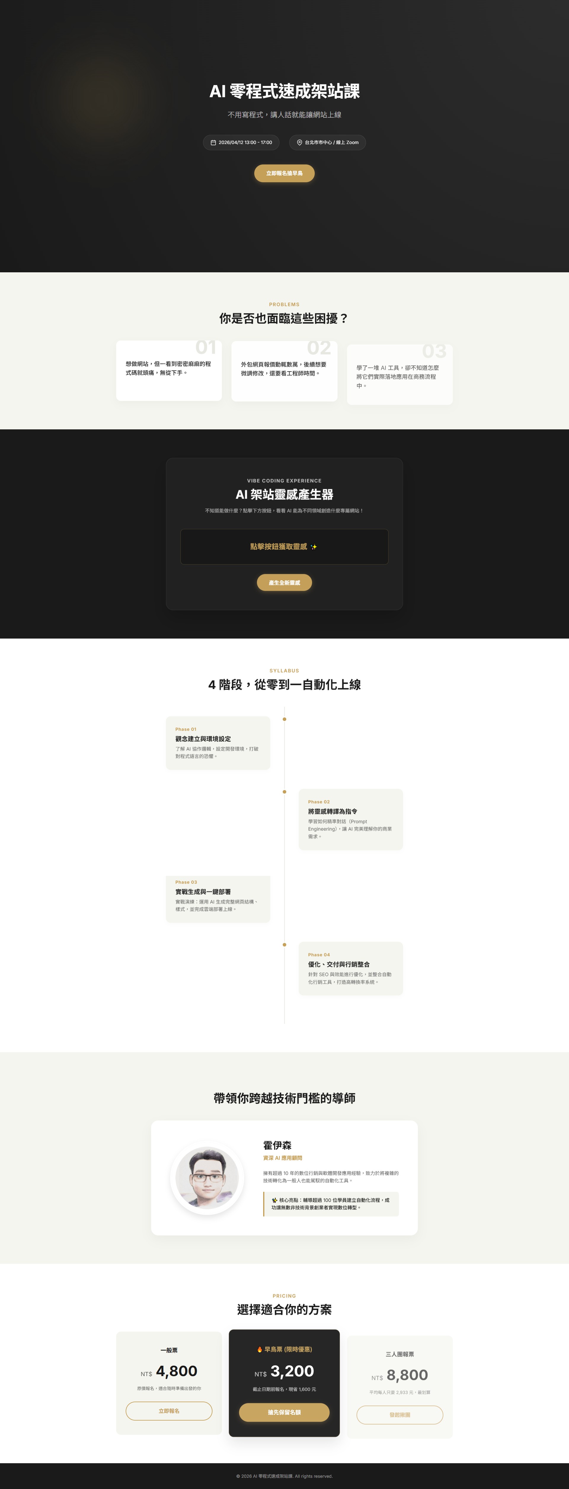 你只需要把你的課程資訊、活動內容填進去,然後丟給 AI(像是 Claude、GPT-4o 或 Lovable/Cursor),它就會自動幫你生成一個: