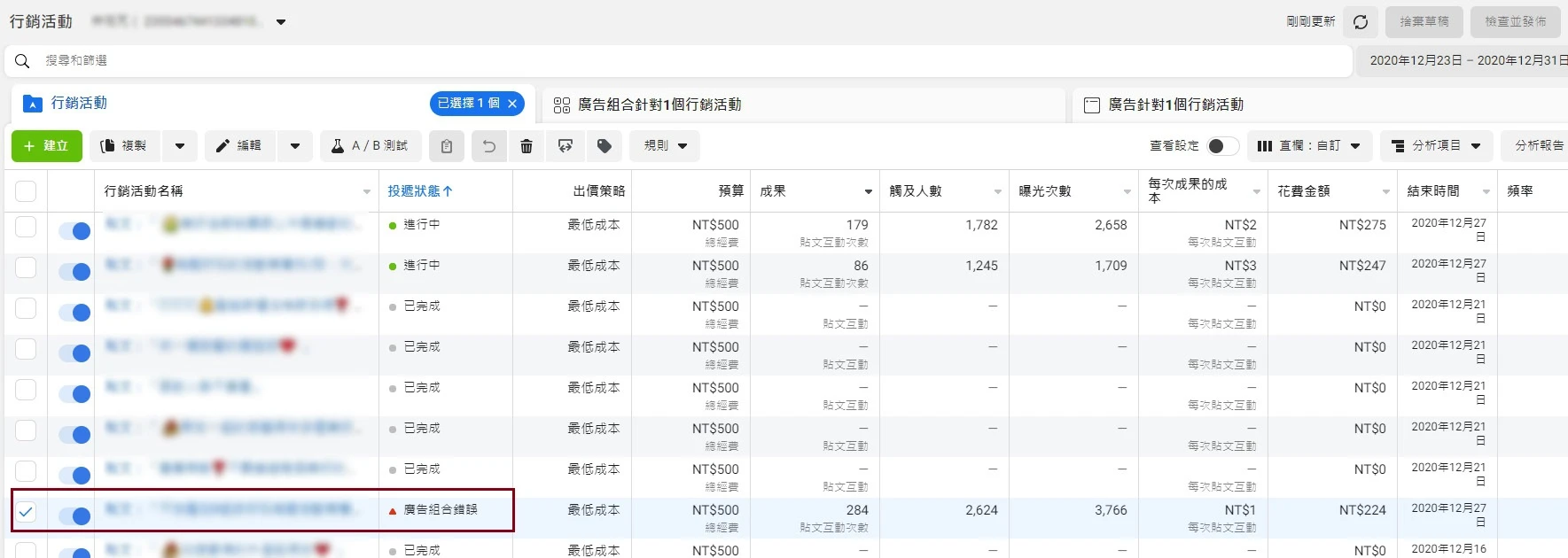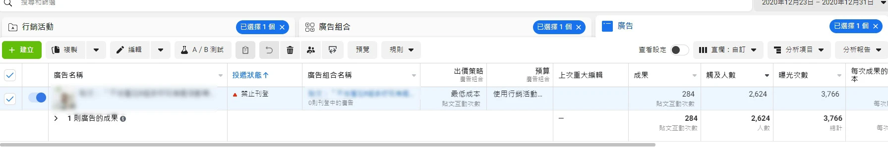 首先我們開啟廣告管理員,在行銷活動裡面勾選,我們要更改的廣告素材文案。剛好我們有一則廣告被fb莫名說規避系統被禁,就用這一篇來修改吧。