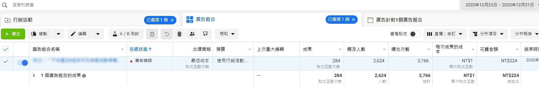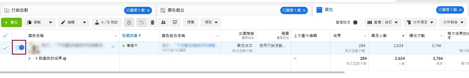 接著確認廣告組合也有勾選起來(圖二)