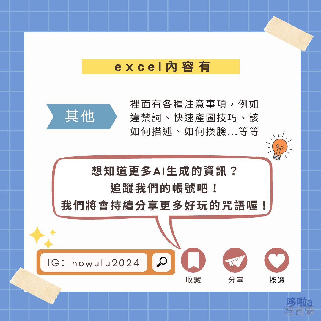 裡面包含了想法教學、提示詞、國內外網友的咒語。如果想要這份 Excel,那就去這個 IG:@howufu2024 ( https://www.instagram.com/p/C2jujMCSLoP/ )置頂貼文底下留言追蹤起來吧!