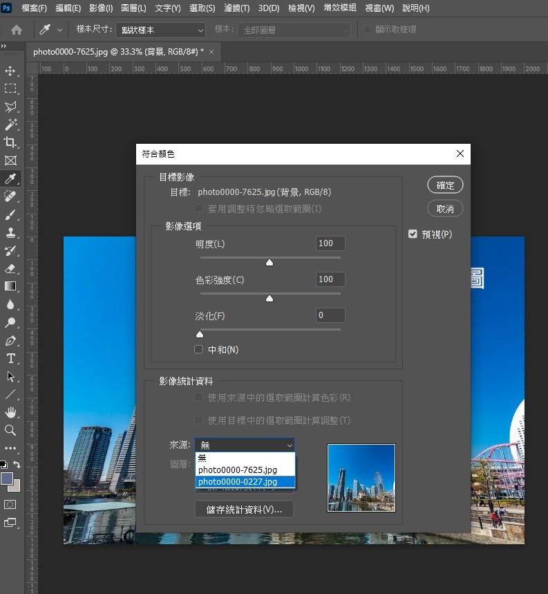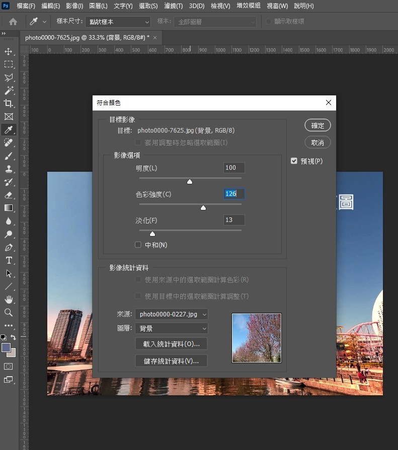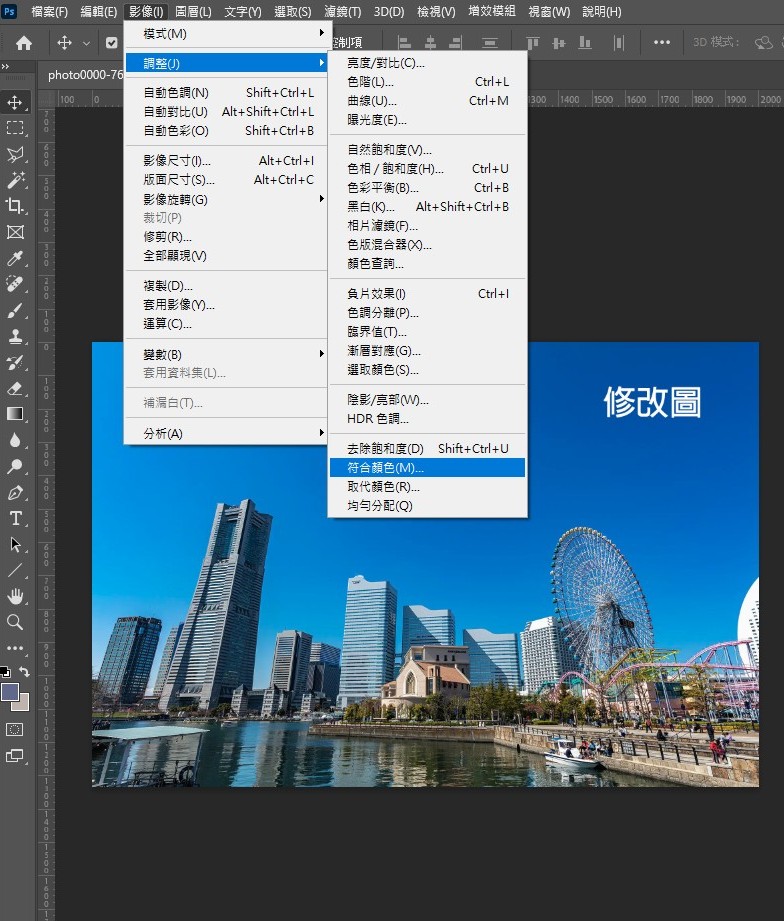 2.接著在預修改的圖,點選【影像】→【調整】→【符合顏色】