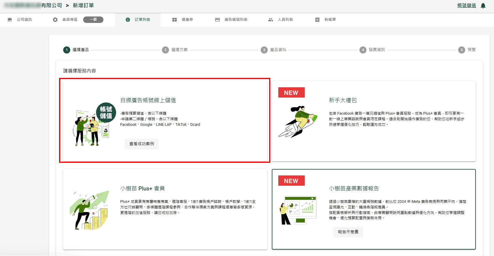 4.在新增訂單頁面,選擇【自操廣告帳號線上儲值】,下一步