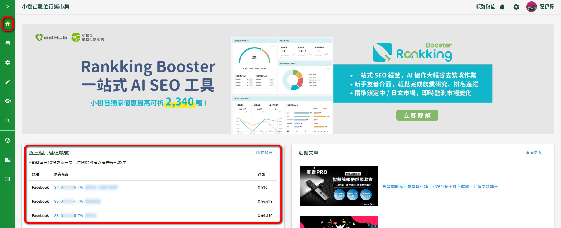 若你擁有平台權限,即可看到目前儲值的廣告帳號剩餘金額