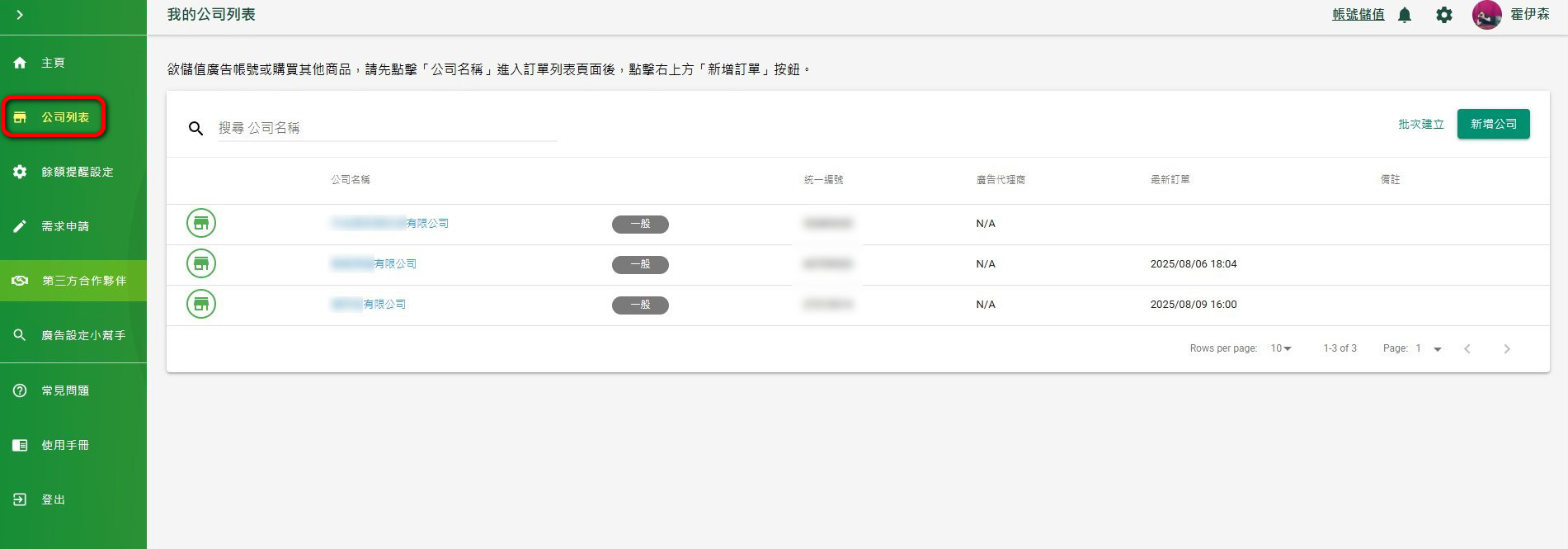 2.若是第一次使用,就不會出現目前儲值的廣告帳號剩餘金額,點選左側【公司列表】,即會顯示你的公司列表,點選你要儲值的公司