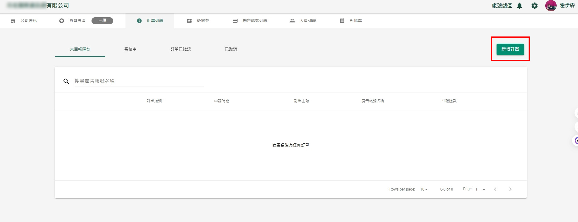 3.在一般訂單,按右手邊的【新增訂單】,就會跳轉頁面。