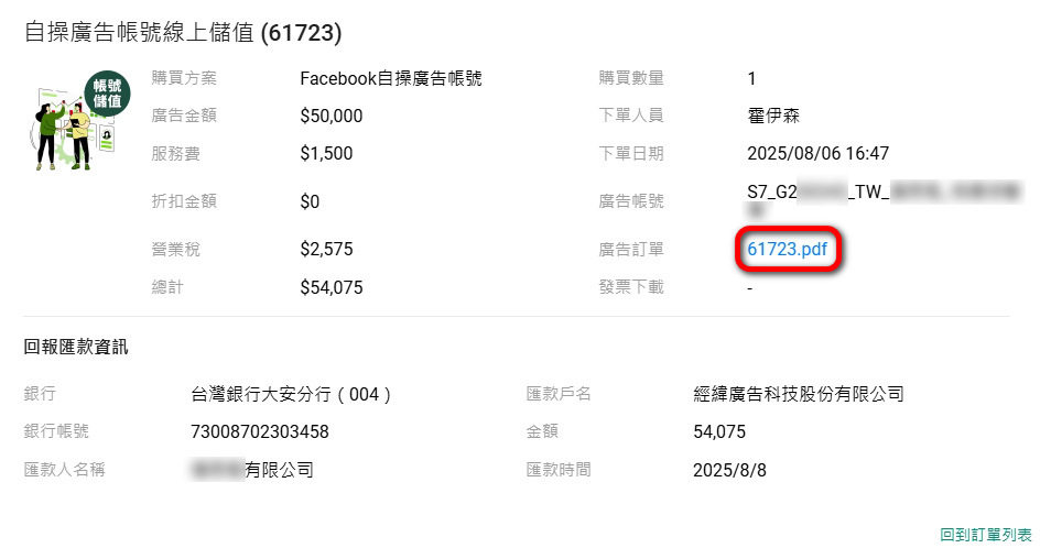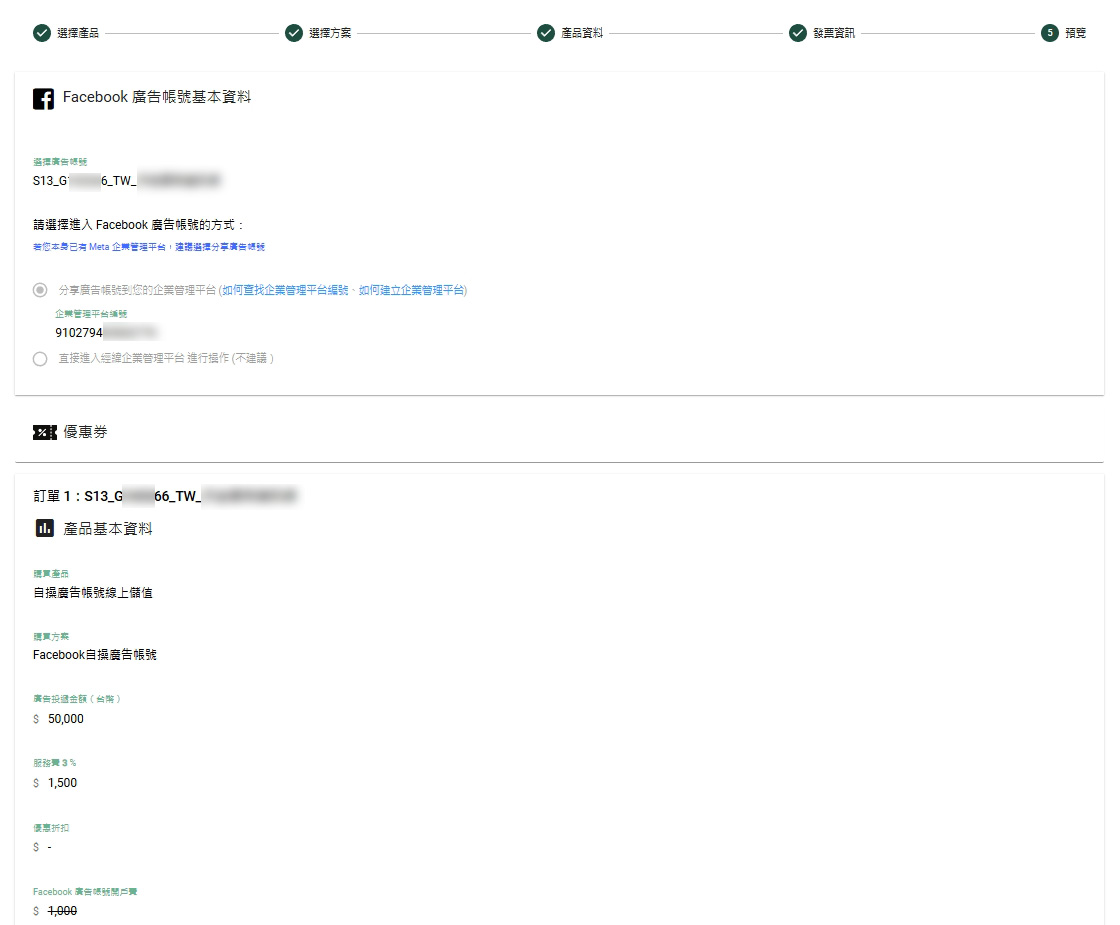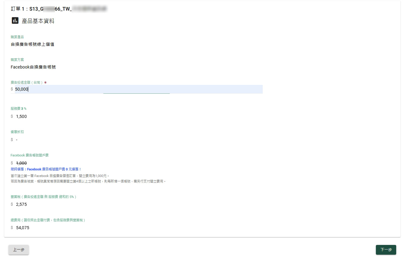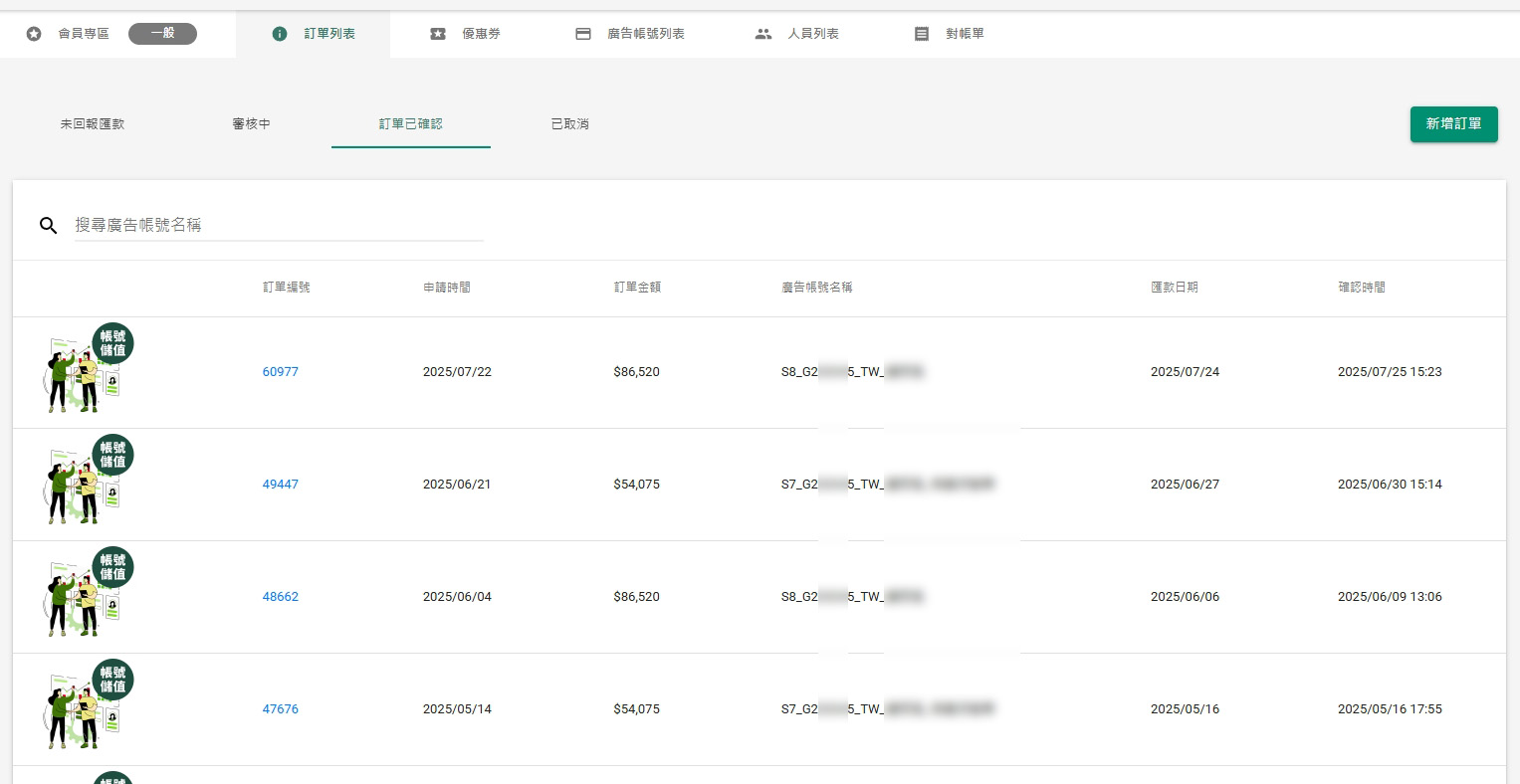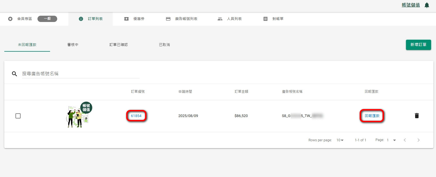 在下方點選你要儲值的廣告帳號,即會自動跳轉到步驟4【新增訂單】頁面