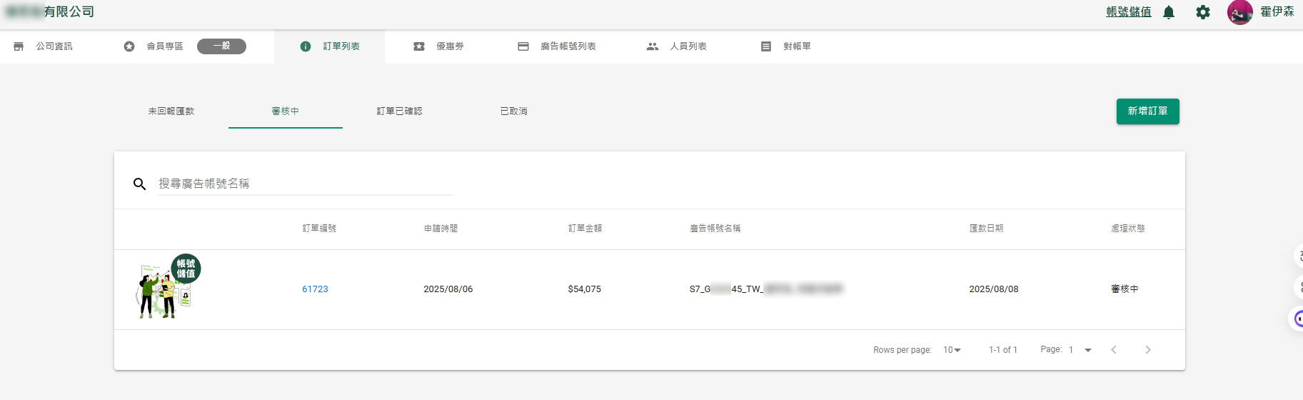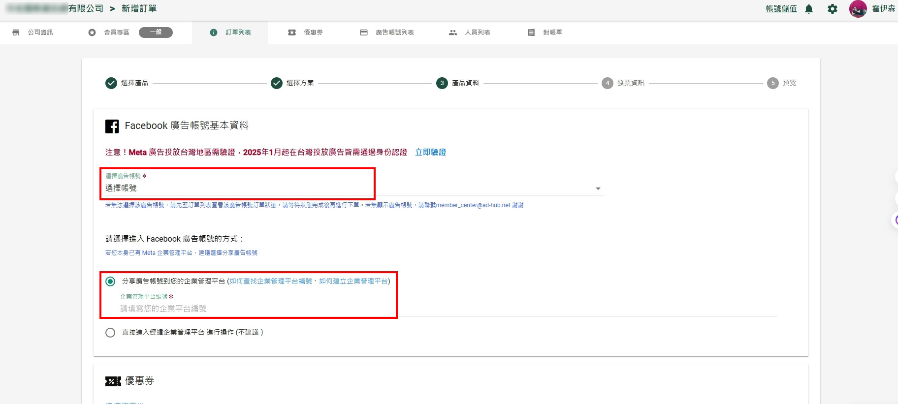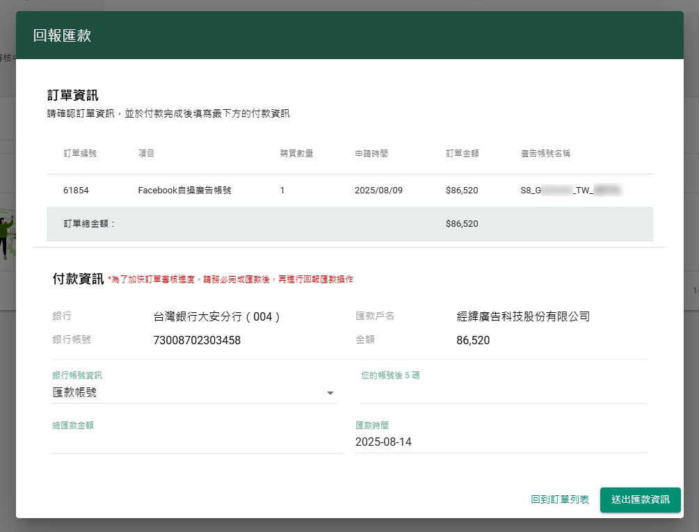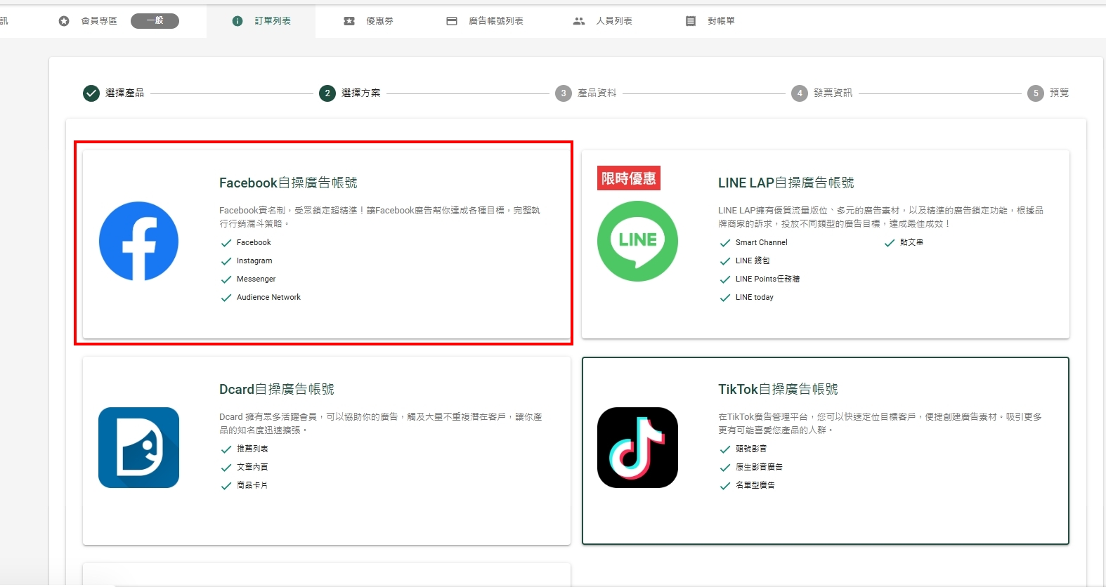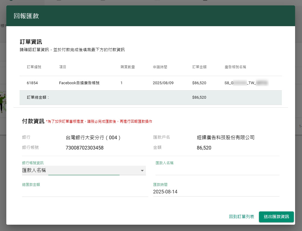 在下方點選你要儲值的廣告帳號,即會自動跳轉到步驟4【新增訂單】頁面