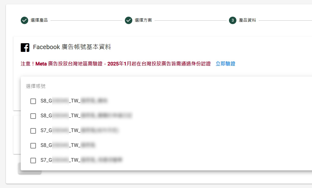 6.在產品資料頁,【選擇你的廣告帳號】,