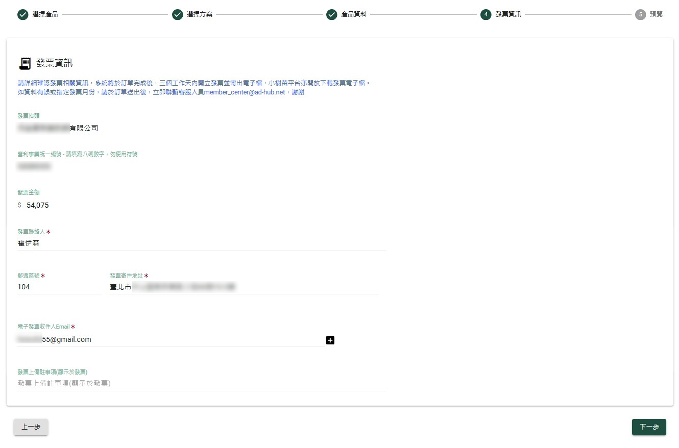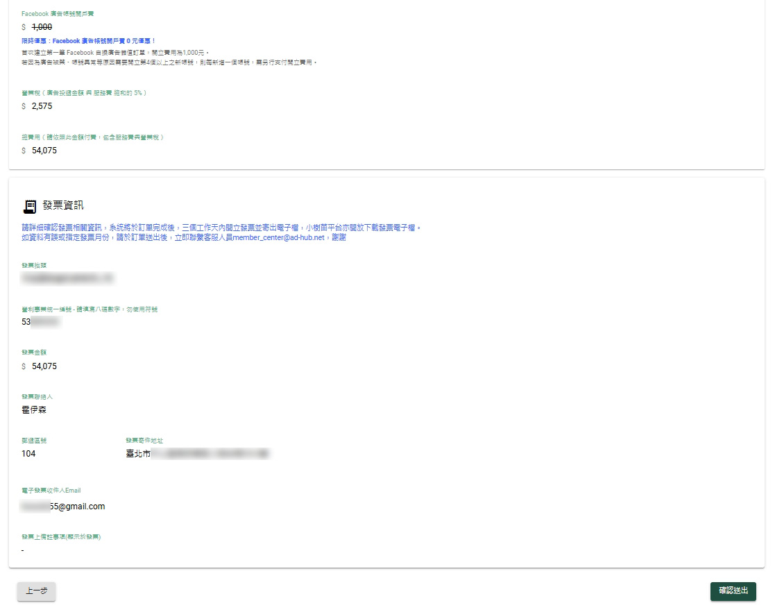 8.會出現發票資訊,確認公司的資料是否有問題,沒問題再按下一步
