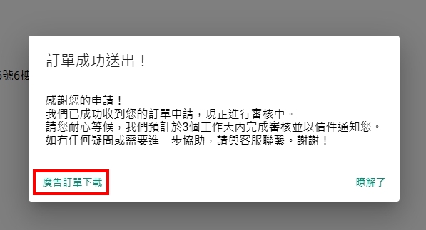 10.訂單成功送出後,點選【廣告訂單下載】,即可下載訂單PDF檔,內有廣告儲值內容