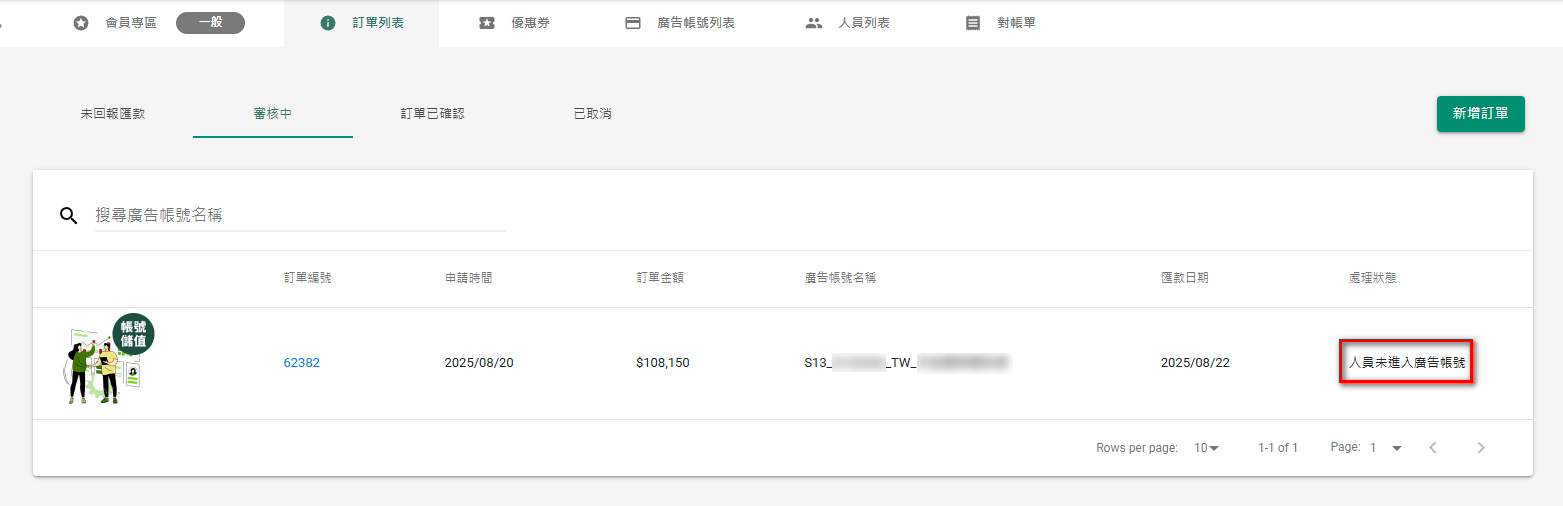 14.若你是第一次申請,則在審核中的處理狀態,會看到【人員未進入廣告帳號】,這狀態會1~2個工作天,這是小樹苗廠商在進行授權開通作業,完成後會有信件通知~