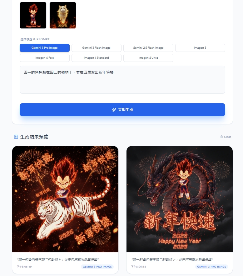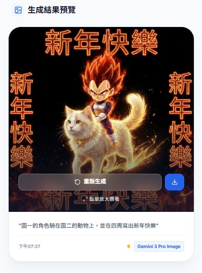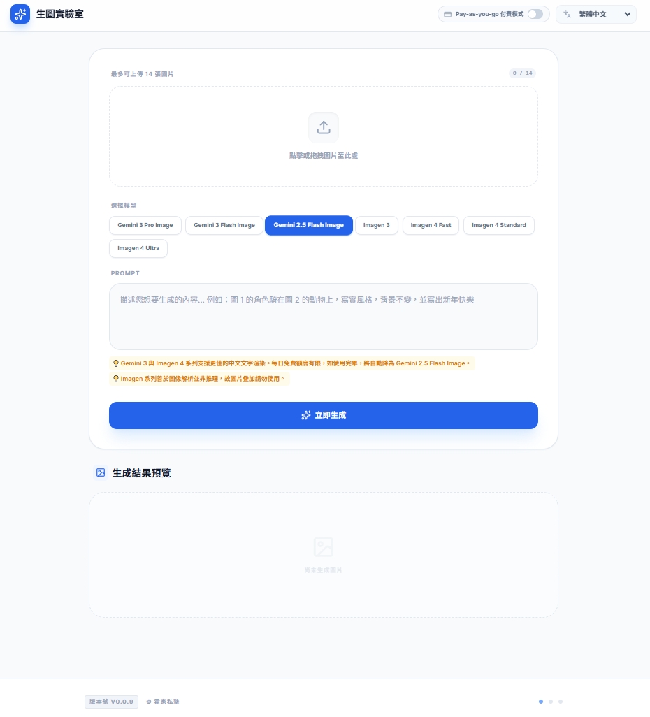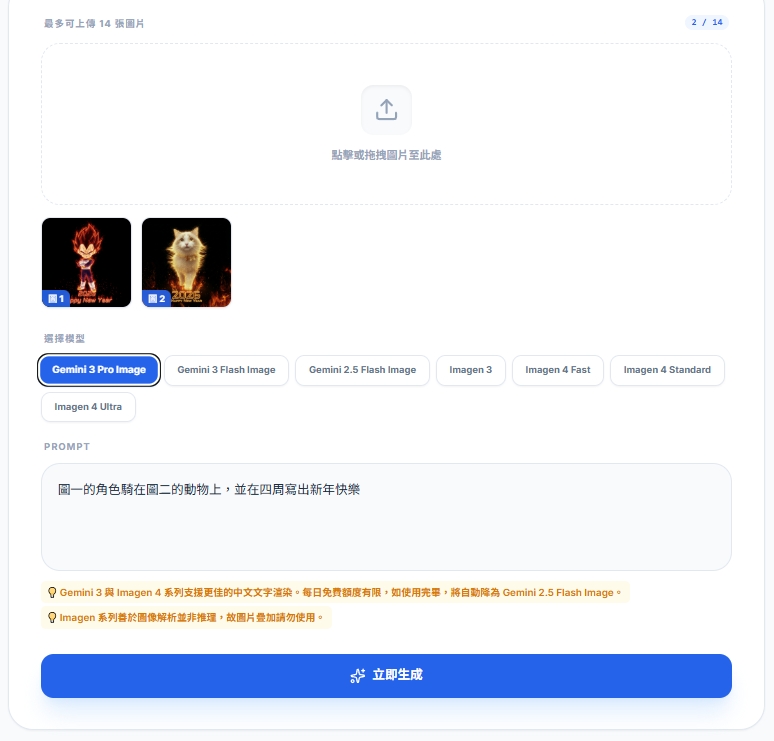 💡 Gemini 3 與 Imagen 4 系列支援更佳的中文文字渲染。每日免費額度有限,如使用完畢,將自動降為 Gemini 2.5 Flash Image。