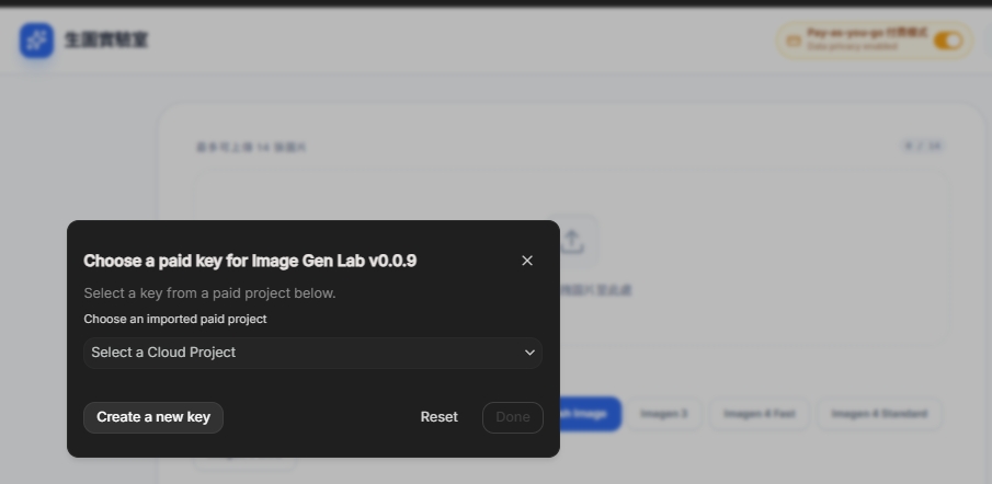 A:系統會自動幫你切換到更便宜的模型(Gemini 2.5 Flash Image),並跳出提示。你也可以選擇輸入自己的API Key繼續使用高階模型。